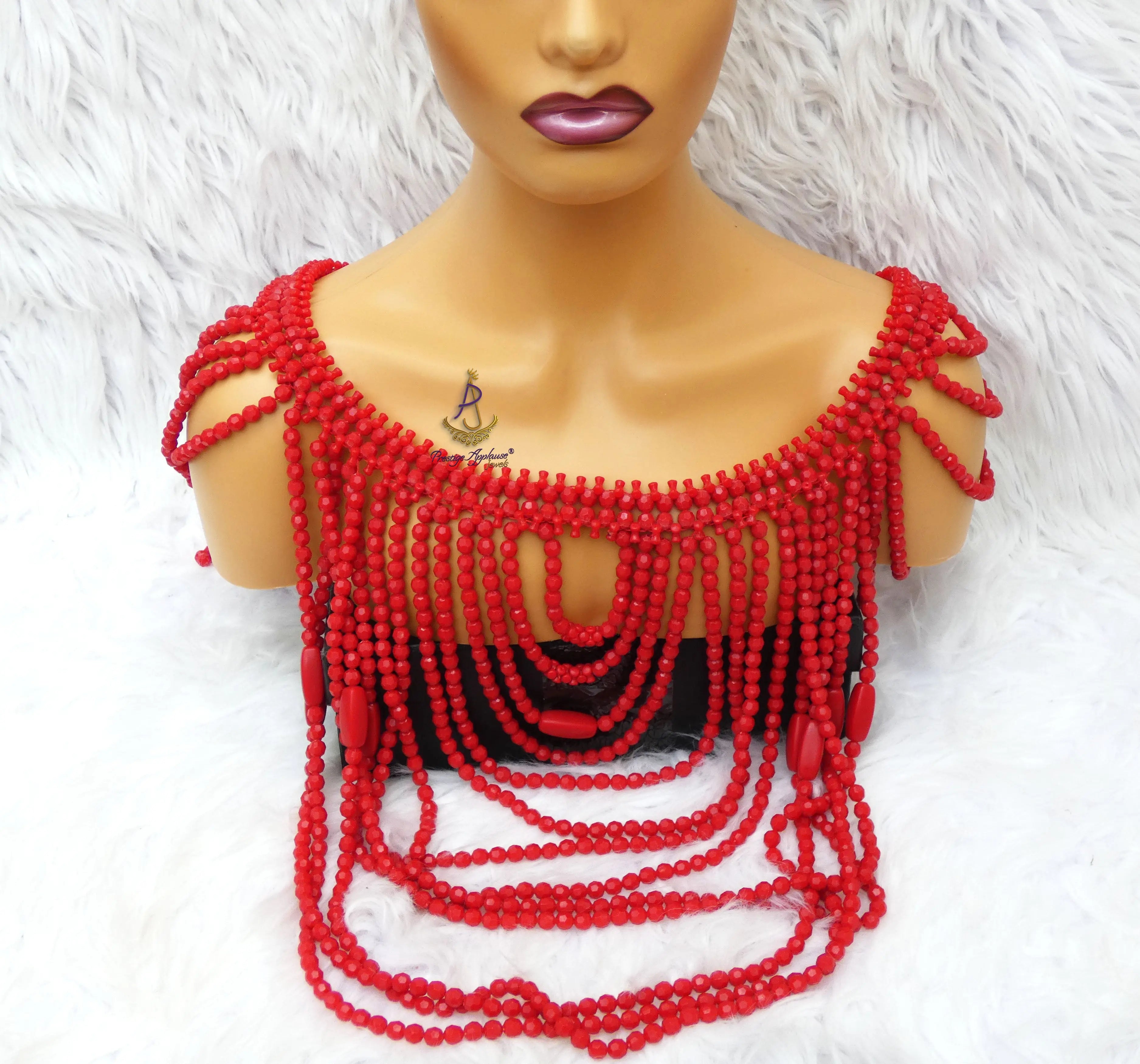 The PrestigeApplause Nigerian bridal wear features stunning craftsmanship that truly elevates your wedding attire. This Edo Delta red coral beaded blouse is designed with meticulous attention to detail, showcasing intricate beadwork that reflects the rich cultural heritage of Nigeria. The vibrant red coral beads are not only beautiful but also symbolize love and prosperity, making this blouse a perfect choice for your special day.