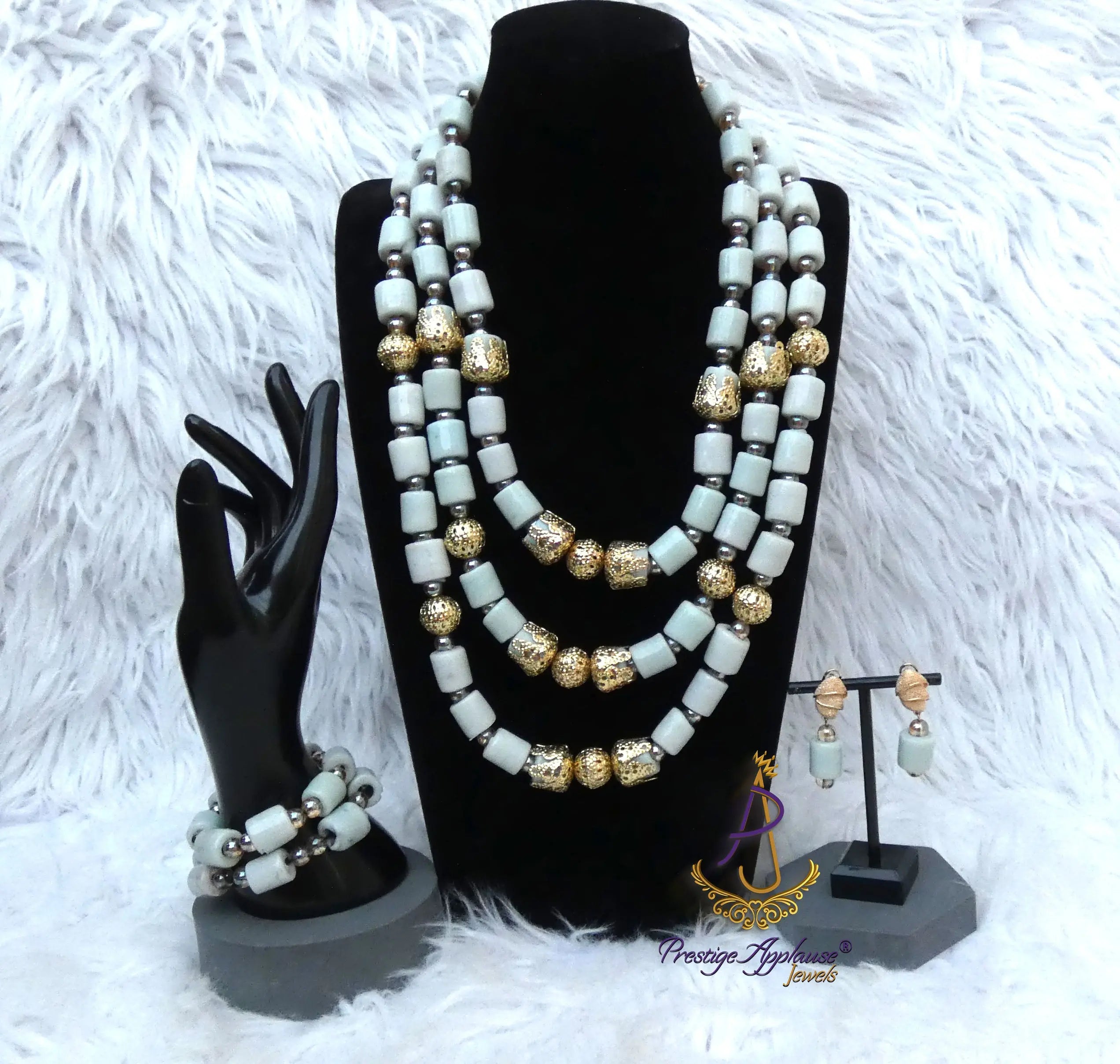 This coordinated set includes a layered statement necklace, a matching bracelet, and drop earrings, offering a complete and polished look. The neutral white tones blend effortlessly with ceremonial attire, bridal outfits, and modern fashion, while the gold accents add warmth and sophistication.