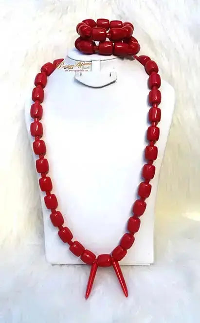 Celebrate cultural heritage and style with the Igbo Elephant Tusk Red Coral Groom Men African Beads Jewellery Set. This complete set includes a striking necklace paired with two matching bracelets, designed to elevate any groom's traditional attire. Crafted from finely detailed artificial beads, the set offers durability while maintaining an authentic look. The vibrant red coral beads symbolise strength and vitality, making this jewellery set a meaningful addition to wedding celebrations or special occasions. Perfectly blending tradition with craftsmanship, it enhances your presence with bold elegance and cultural pride.