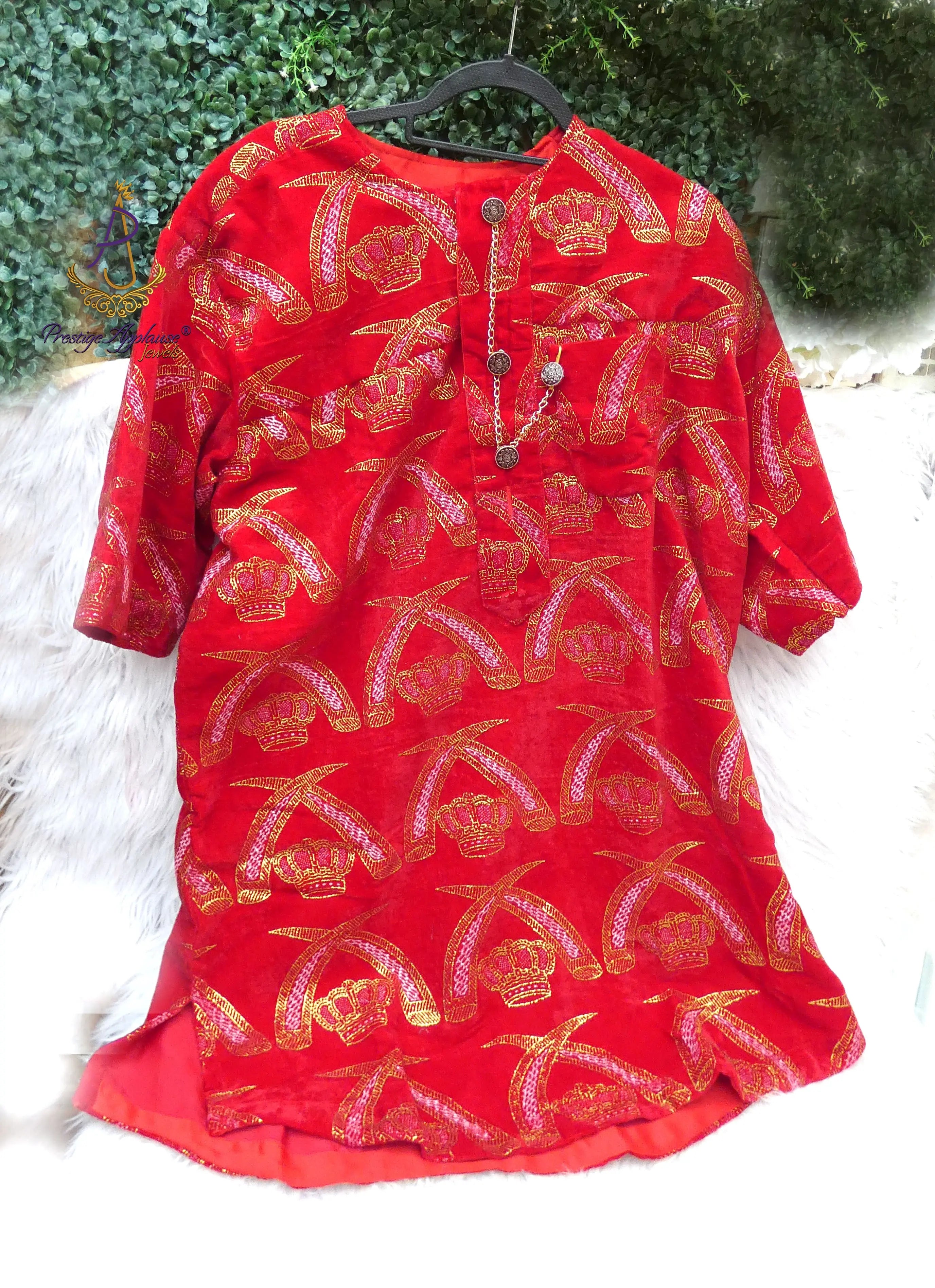 This exquisite Royal Crown Velvet Traditional Top is crafted for those who value heritage, prestige, and refined elegance. Designed in a rich crimson velvet base, the top features gold embroidered crown motifs, symbolising leadership, honour, and nobility across African royal traditions.